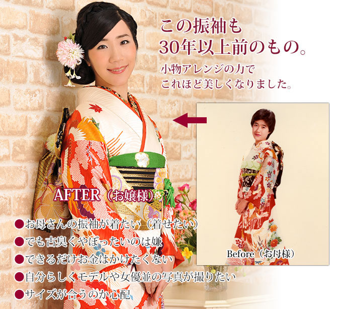 お母様、お祖母様の振袖をお持ち込みしていただき、不足するものだけをレンタル(お買い上げも可能)お好みのスタイルにアレンジできます。ご相談、コーディネートは無料です。